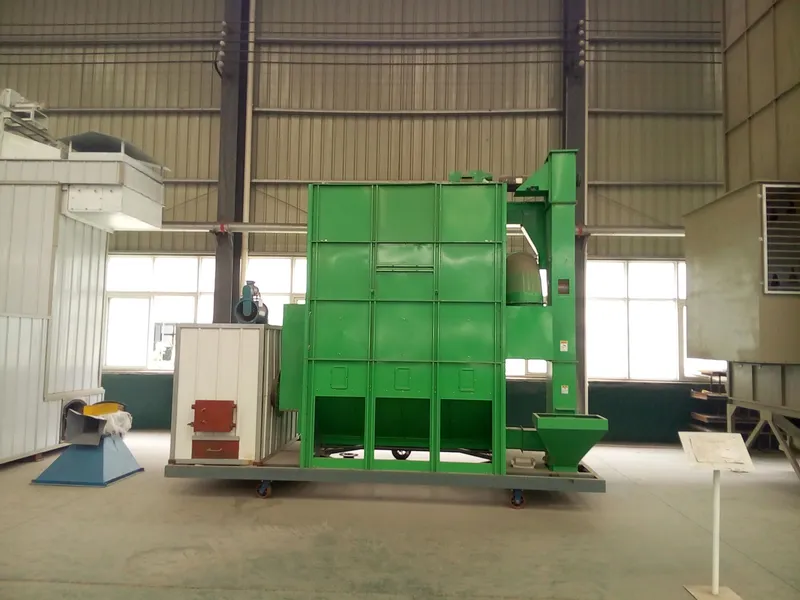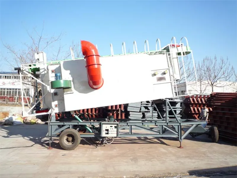 移动式小型粮食烘干机主要由烘干段,缓苏段,冷却段等组成,采用混流烘干技术,以干净热空气做介质,可单次或循环烘干。粮食在重力作用下沿着角状盒之间的通道由上向下缓慢的流动,热风则由进风角状盒进入烘干机内部,然后穿过粮层流向周围的排气盒,然后变成废气而从排气盒排出机外。粮食在烘干机内受热升温,温度是个交变的过程。由于粮食层较薄,风机功率小,电耗小,也降低了成本。热风炉由炉体和热交换器等组成,以煤、秸秆、废木材、稻壳等作燃料。换热器由耐热材料制成,因而有热效率高,使用寿命长的优点。